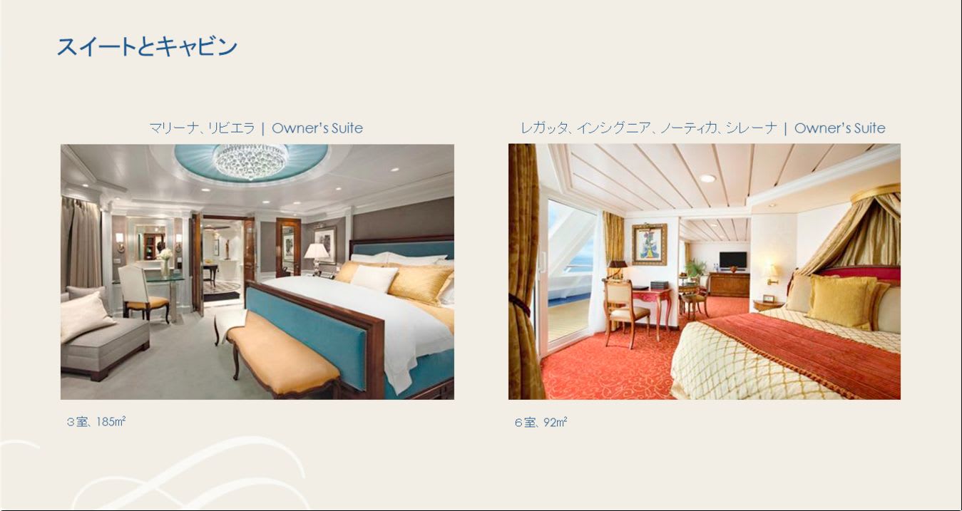 まずお泊りになるにあたり、非常に重要となる船内キャビンのご説明なんですが、こちらのお写真にございますのは最上級のスイート、「オーナーズ・スイート」でございます。