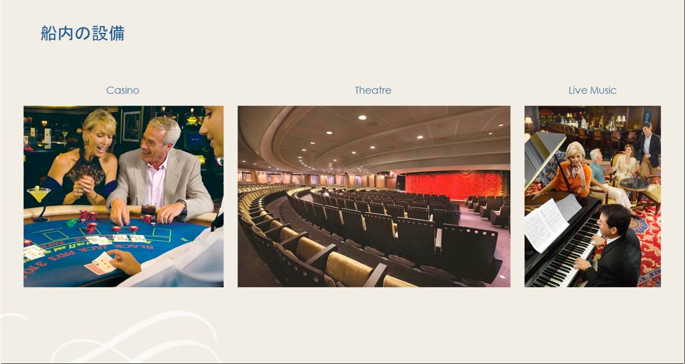 それ以外にもカジノ、毎晩エンターテイメントをご提供するシアター、そして生演奏、カルテットだったり、ピアノの生演奏をラウンジで楽しんでいただくことが可能です。