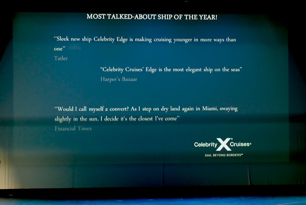 ちょうど2017年はこのセレブリティ・クルーズが初めて自主運行をおこなった最初の年になりますが、その1年目にクルーズ・オブ・ザ・イヤーのグランプリを受賞させていただきました。