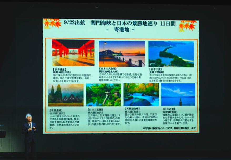 寄港地はこのように日本各地を周っていきますので、日本のお客様にも非常に喜ばれる、また日本海側の寄港地を充実させておりますので、これを陸路でいくよりも船でいって、風光明媚な日本の寄港地を楽しめます。