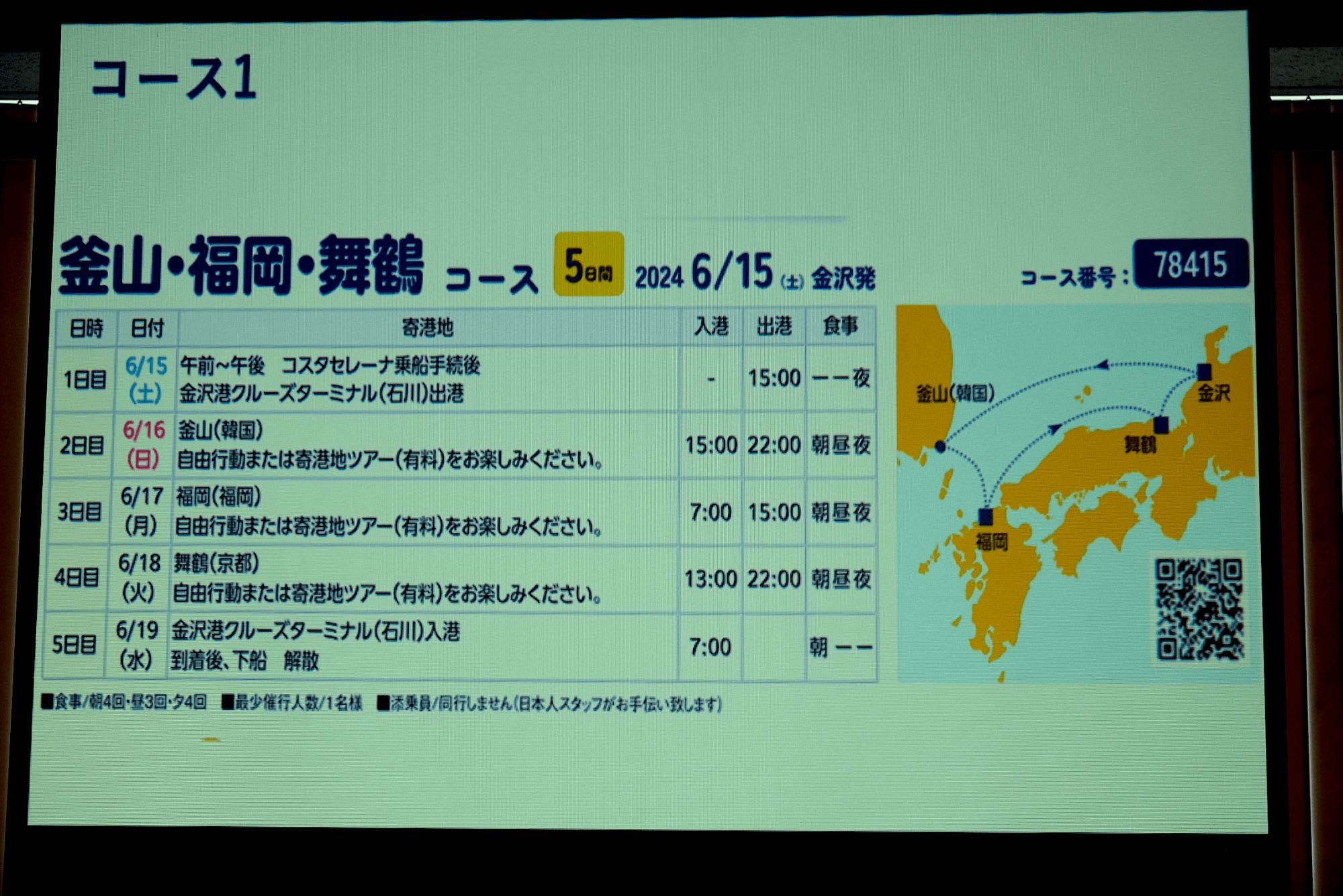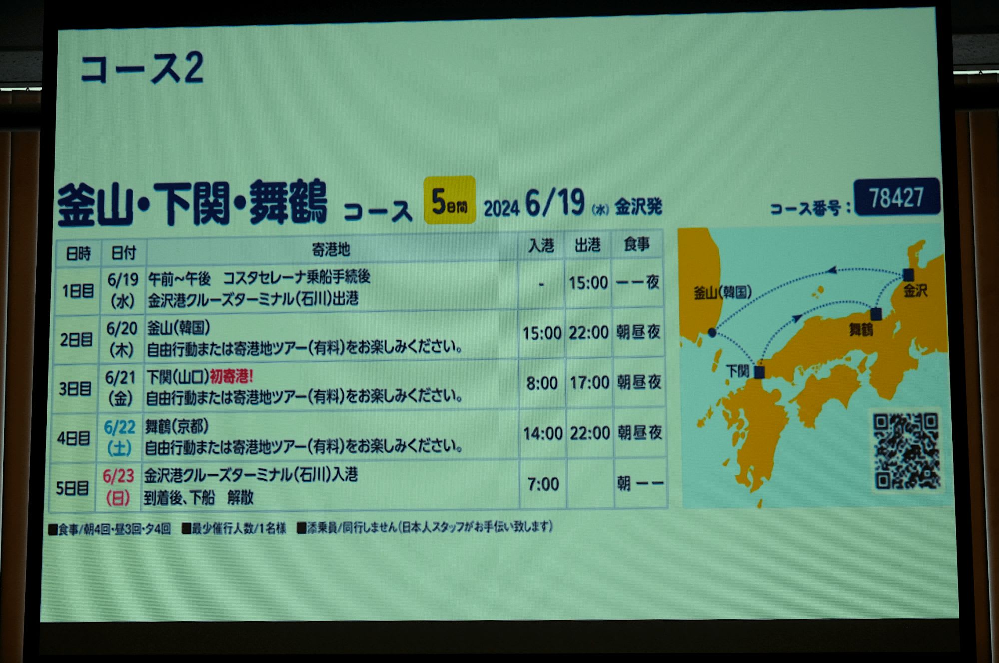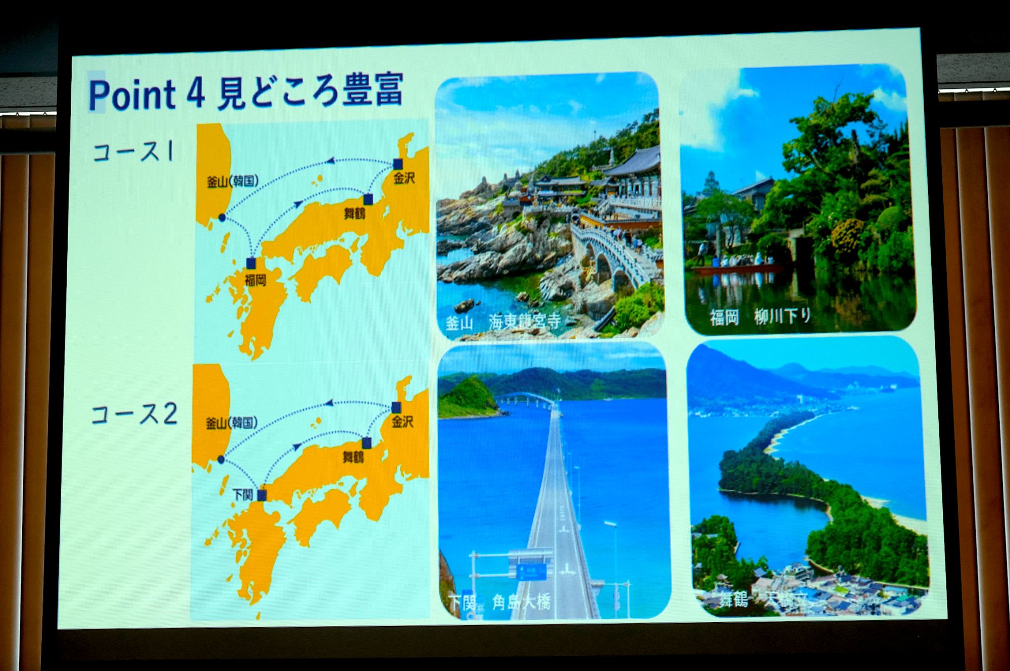 今回なんですけれども、福岡、下関、舞鶴といった、魅力的な観光地を寄港するコースとなります。