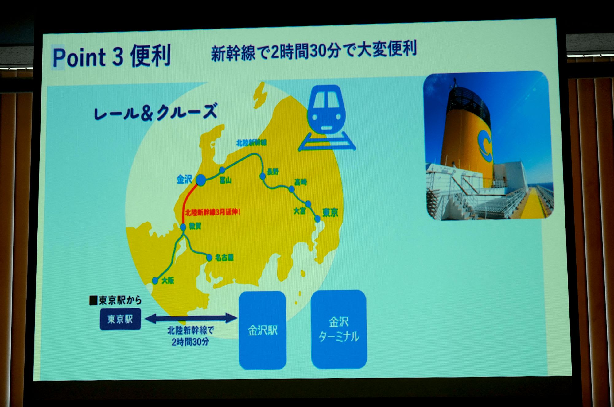 金沢港は、東京からですと、北陸新幹線で1本で向かっていただけるという好立地で、新幹線で2時間半で向かっていただくことができます。