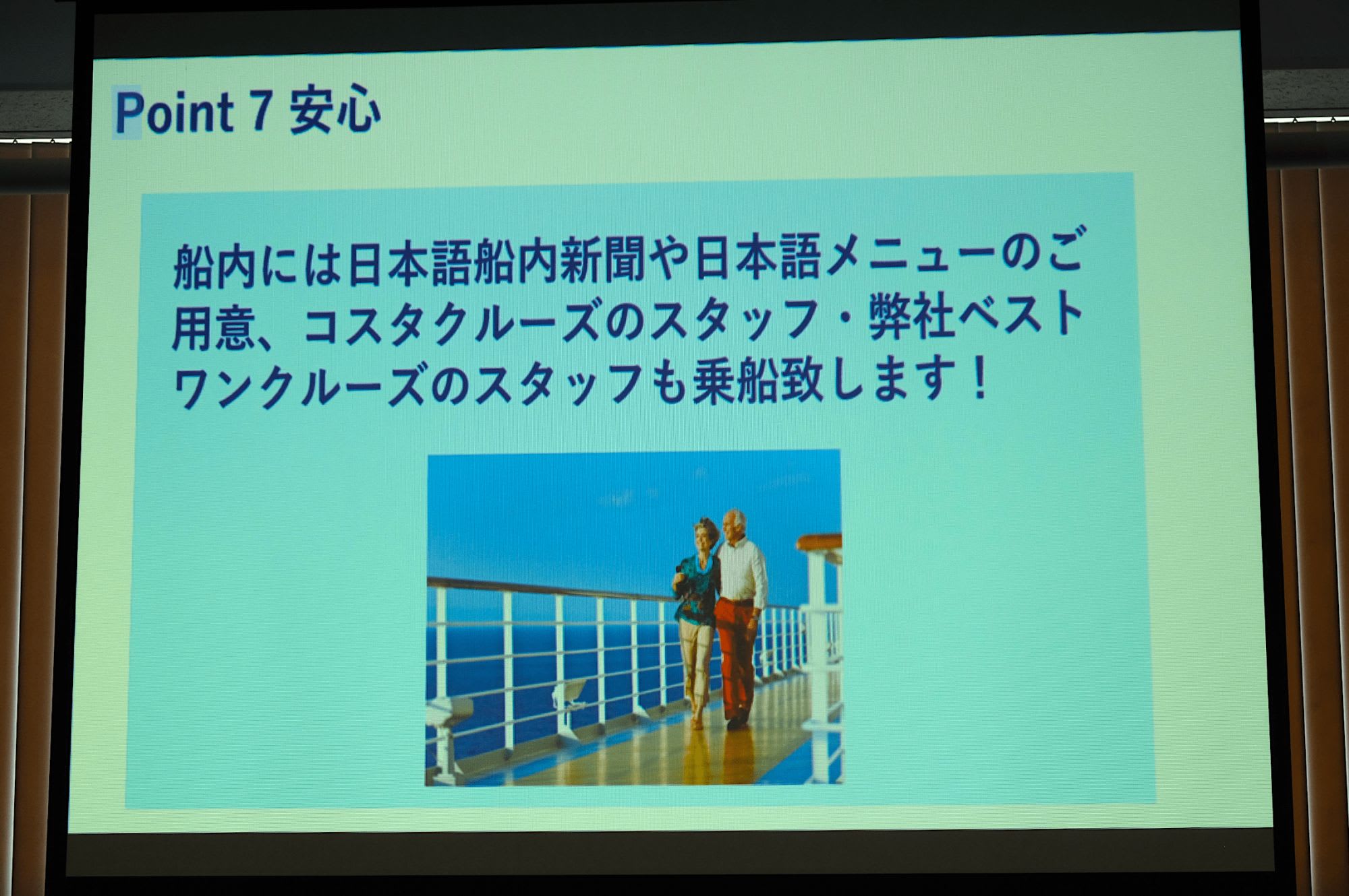 またコスタクルーズのスタッフもですね、結構アジア系のクルーも多くおりますので、少し日本語が喋れるというクルーもおります。