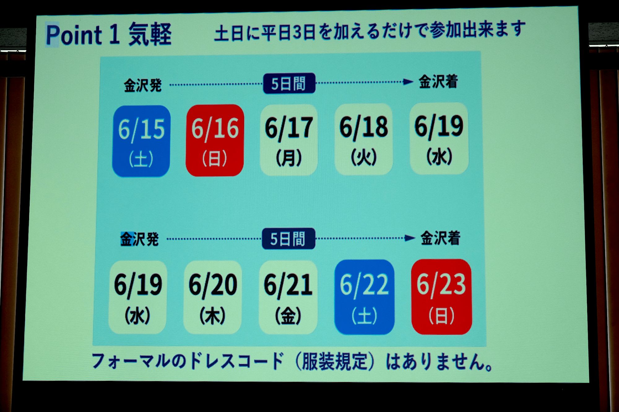 6月15日発ですと、15・16が土日。6月19日発ですと、22・23が土日となりますので、3日間お休みを取っていただければ、ご参加していただける日程になります。