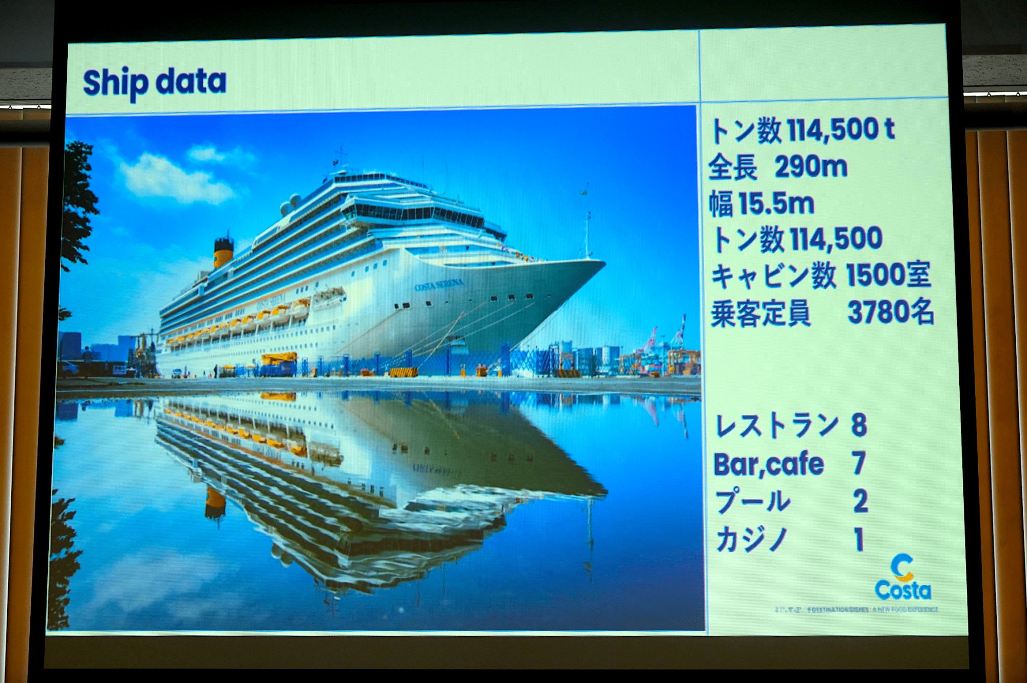 総トン数は、114,500トンでございますので、コスタクルーズの日本発着をおこなってきた客船中、過去最大のものとなります。