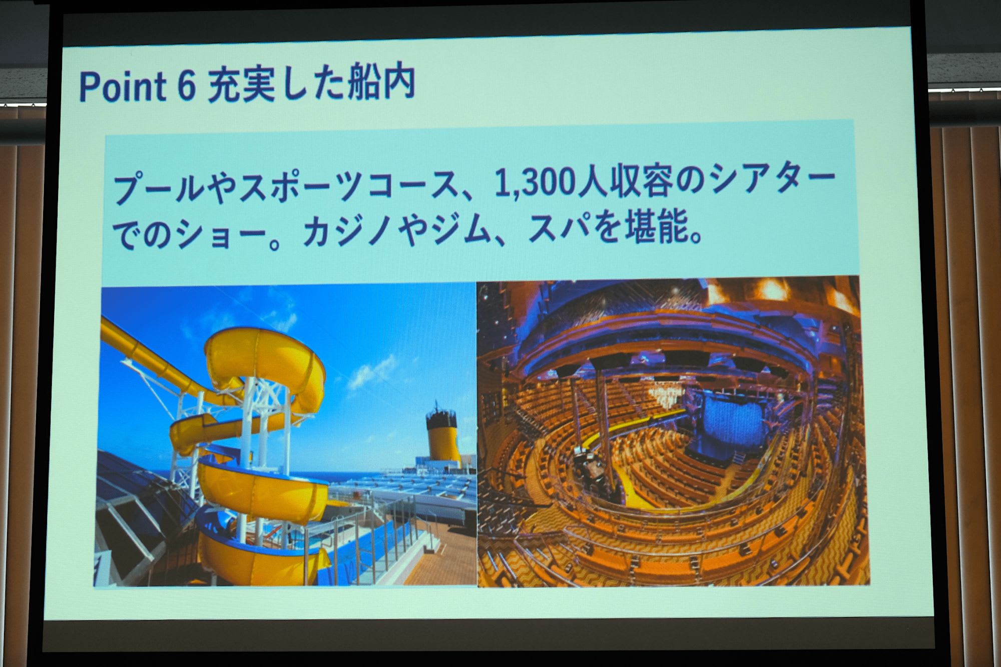 そして充実した船内で、先ほどのメインダイニングも非常にきらびやかで豪華なところだったんですけれども、その他にもプールやスポーツエリア、あとは1,300名を収容できるシアターもございます。