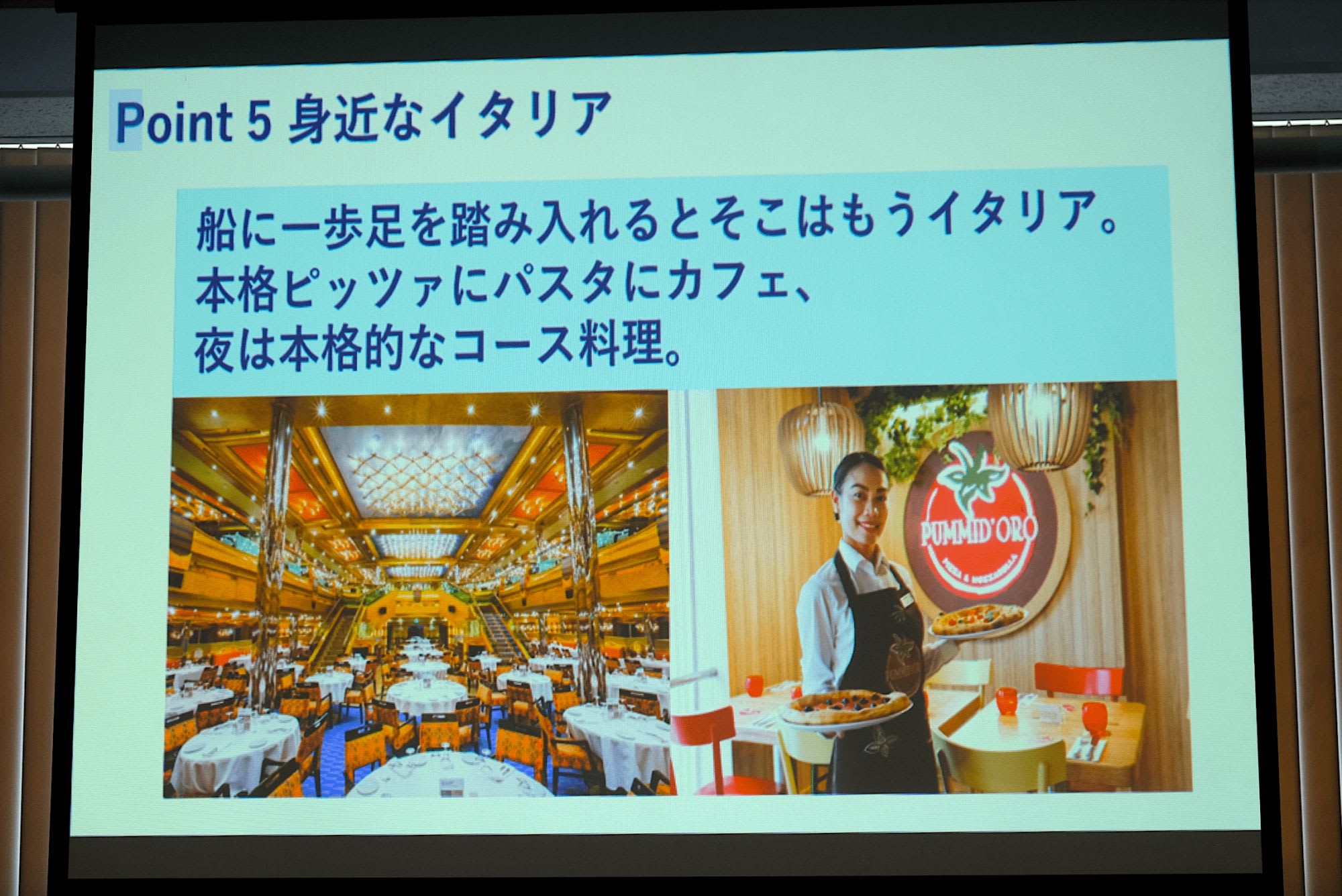 続いて、船内の具体的な施設の様子などをご案内させていただきたいと思います今回はコスタクルーズより、ご担当の水谷様をお呼びしております。