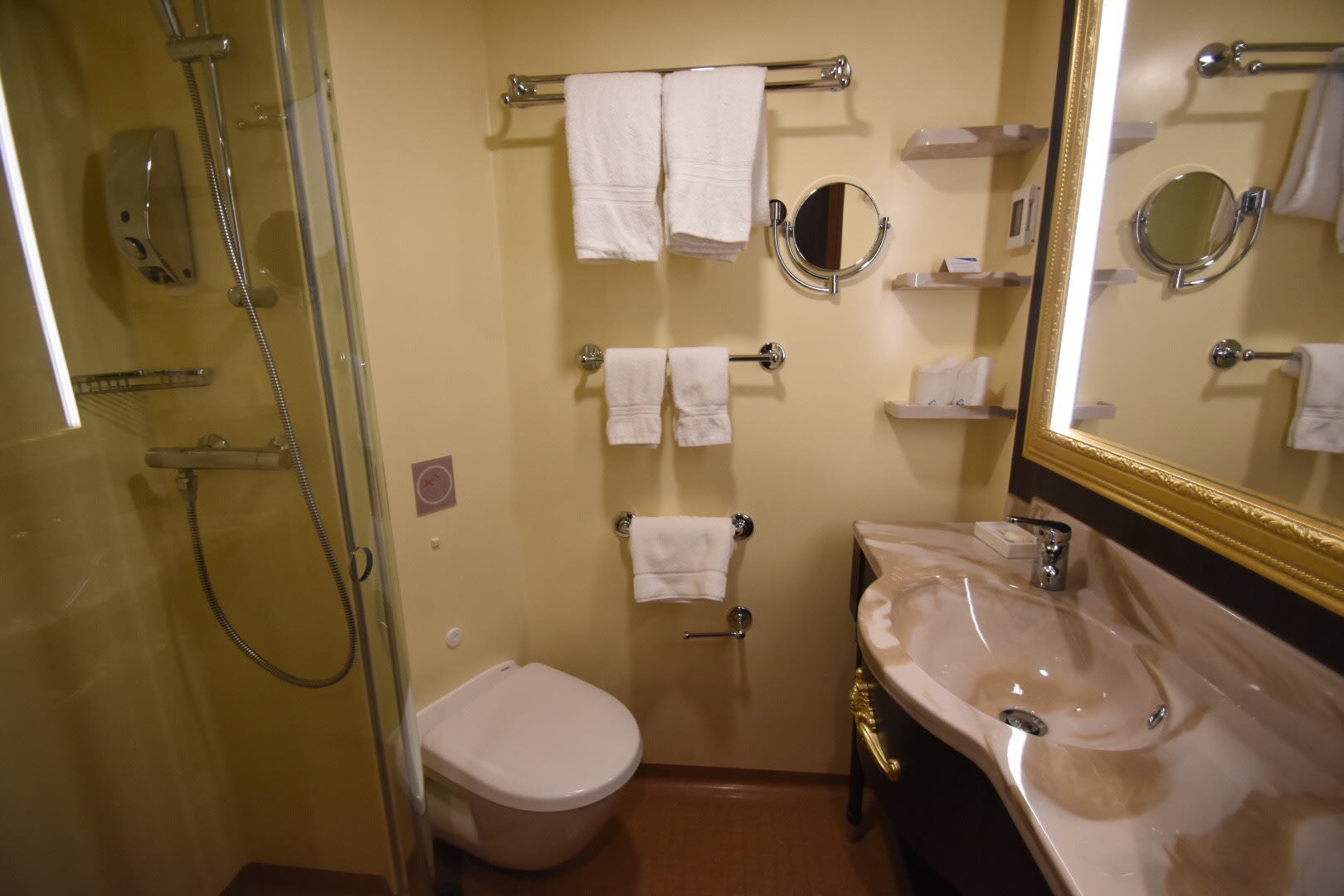客船内で自然と目に入ってくるのが、レストランやトイレの入り口などといった、あらゆるところに置かれたプッシュ型の手指アルコール消毒です。