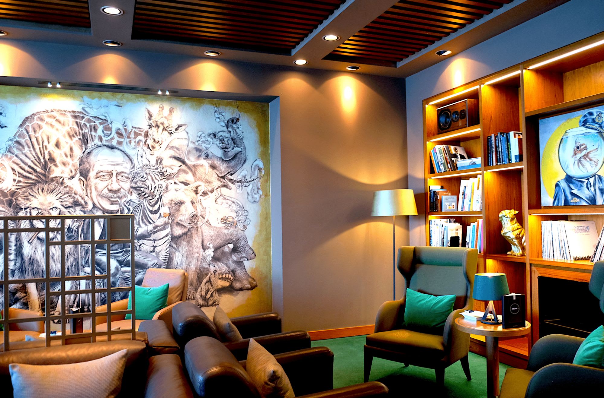 壁に描かれた不思議なアート作品の中で葉巻をお楽しみ