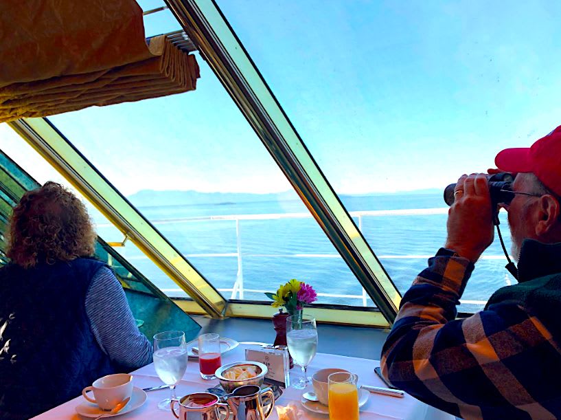 クジラが見えると教えてくれる隣の席のご夫婦。朝食から双眼鏡は手放せません!