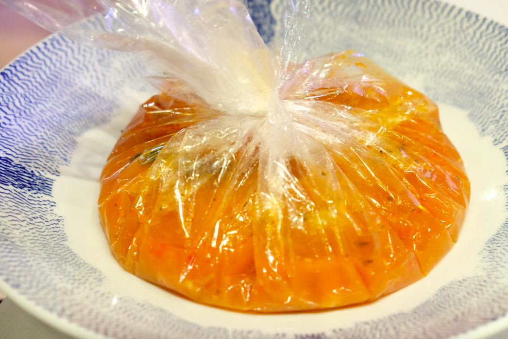 bouillabaisse marseillaise(ブイヤベースマルセイユ風)お皿に袋が載せられてきました…驚かせてくれますね!