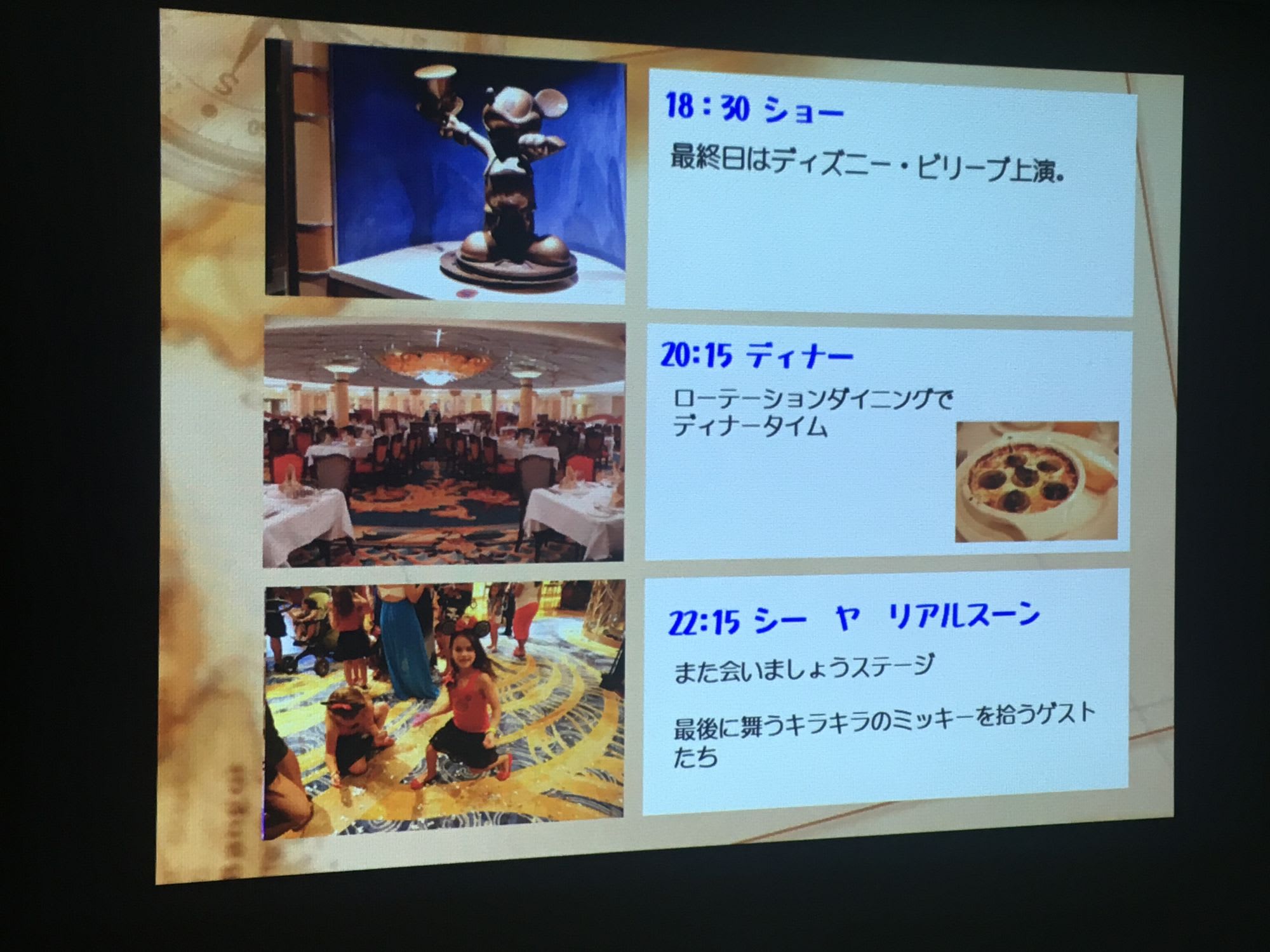 この最後のときにスクリーンがおりてきまして、(クルーズ中の)お客様が楽しんでいる様子をキャストが撮影した思い出のシーンが流れまして、最後にミッキーが壇上に上がりまして、「また会いましょう」って言ってくれるんですね。