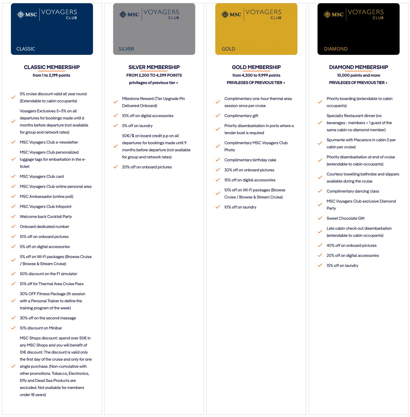以下は、MSCクルーズ UKの公式HPにて掲載されているボヤジャーズクラブ会員ベネフィット(特典)。