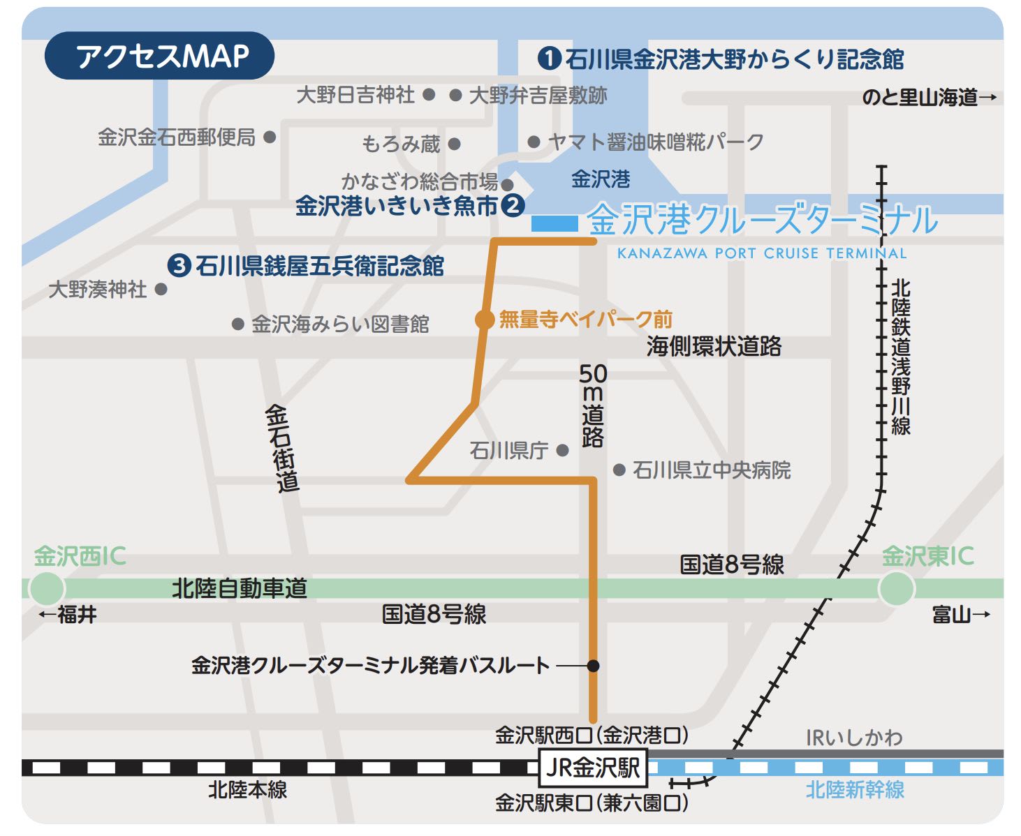 金沢港は「金沢港クルーズターミナル」に入港予定で、このターミナルはフォトスポットとしても有名となっている、鼓門(こづつみもん)が美しい金沢駅から車で約15分ほどの利用しやすい場所に位置しています。