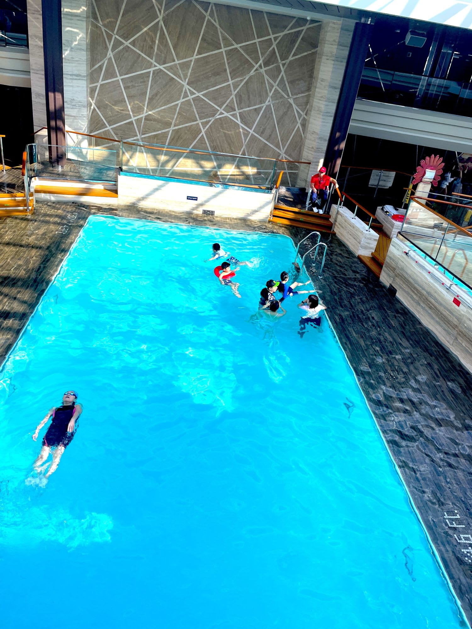我が家は子供3人ともプールが大好きで、普段も止めないと3時間くらい平気で入って遊んでしまうほど。MSCべリッシマの船上にはプールが複数あると聞いていたので、プール遊びはこのクルーズの大きな楽しみの一つでした。