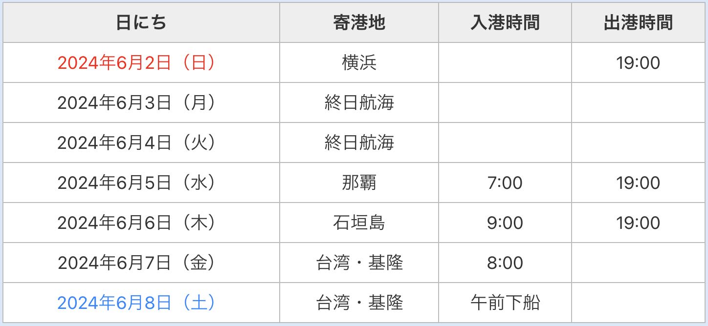 ずばり「横浜出航/台湾・基隆着」で効率が良い航程!