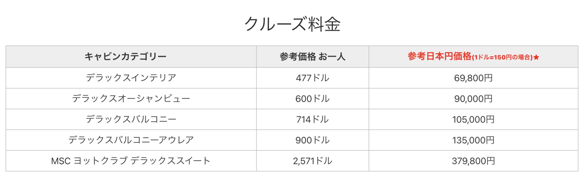 ※ 料金は空室状況等により変わる場合がございます。また、お支払いはクルーズ料金全額一括となります。