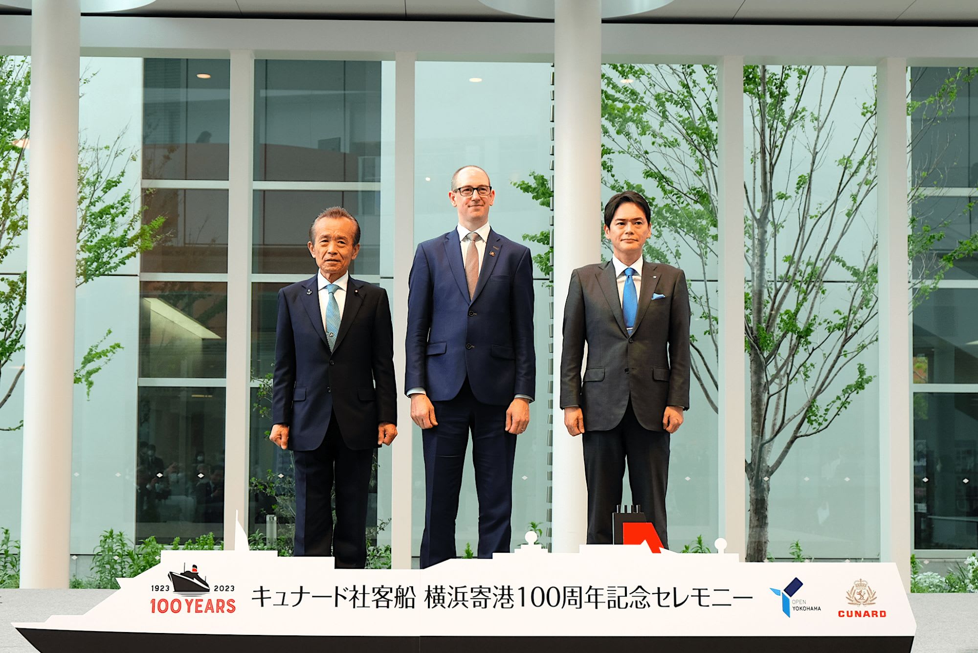 2023年4月19日、横浜市庁舎1階アトリウムにおいて、キュナード社と横浜市が共同で「キュナード 横浜寄港 100 周年記念セレモニー」を開催しました。