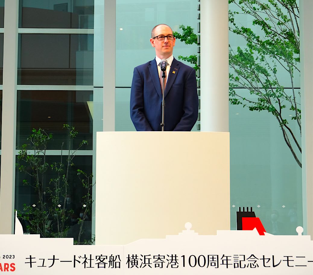 セレモニーは、キュナード社の歴史についての説明から始まり、登壇したマット・グリーヴス副社長は、キュナード社が創業以来築いてきた歴史や横浜市とのつながりについて語り、クイーン・エリザベスが約4年ぶりに日本発着(横浜発着)クルーズを再開することを発表しました。