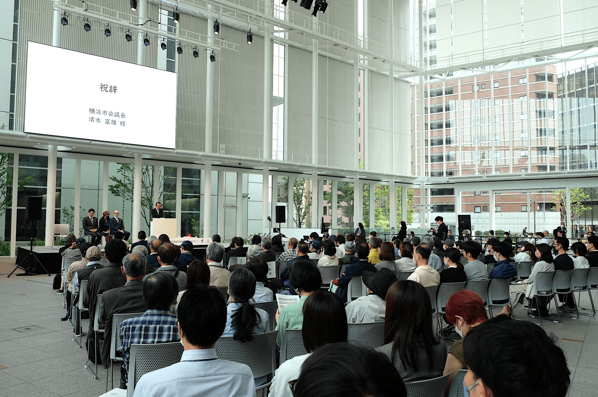 この記念セレモニーは、横浜市庁舎1階アトリウムで開催され、山中竹春横浜市長やキュナードの北米・オーストラレーシア地域コマーシャル担当副社長マット・グリーヴス氏が登壇しました。