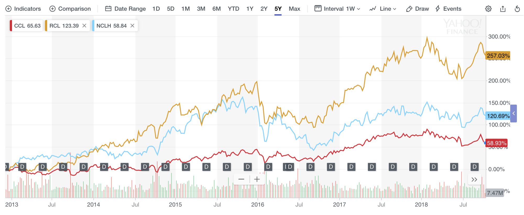 株価のパフォーマンスとしては、ロイヤルカリビアンがほか2社よりも高くなっていますが、いつの時点を比較の起点とするかによって変わるので、一概には何とも言えないです。