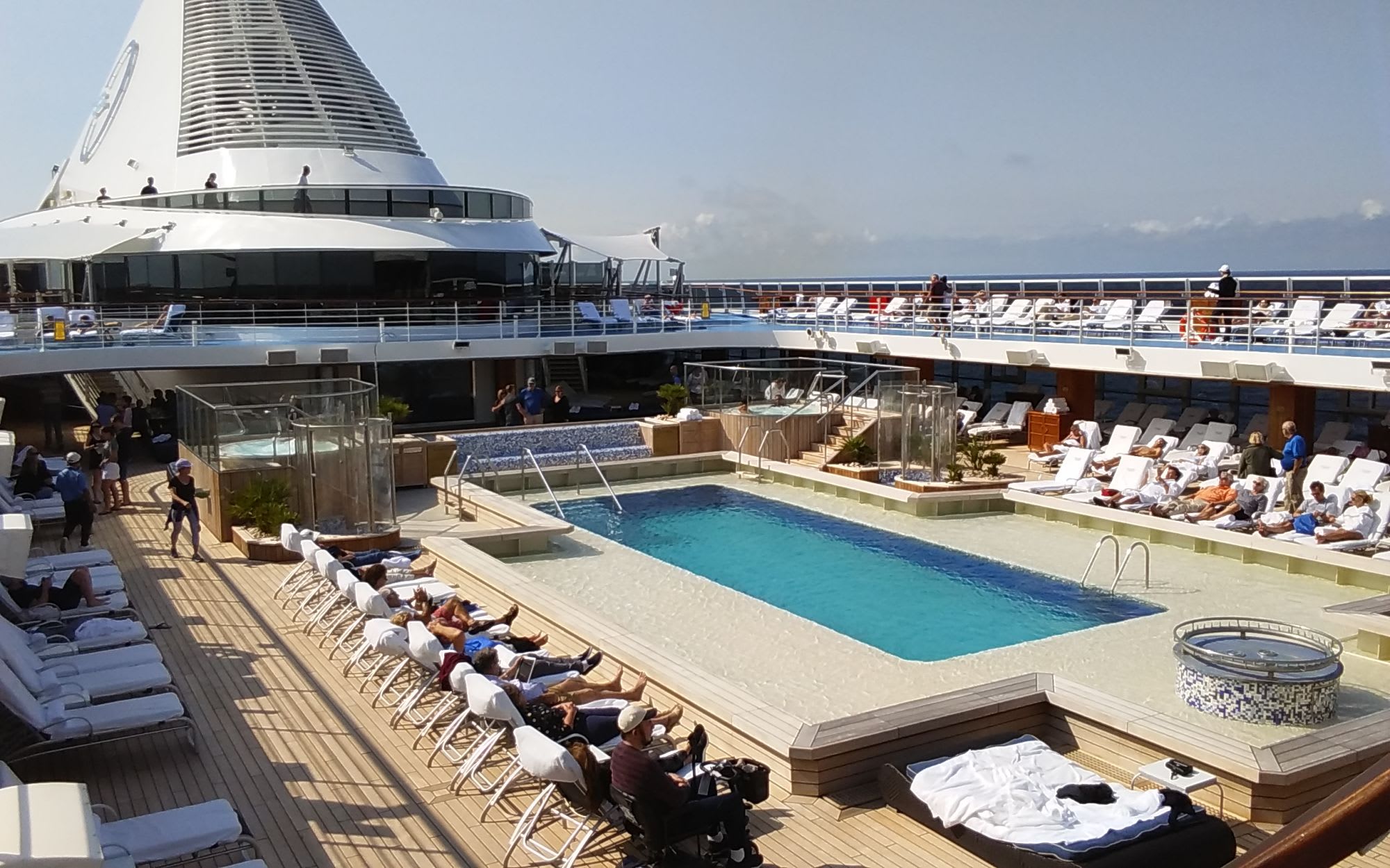 何と言っても「何もしない、をする」です。アグレッシブに寄港地で世界遺産巡りやディナー、読書、スポーツ等々様々な楽しみがありますが、最近は、あえて寄港地では近くの旧市街だけ徒歩で軽く楽しみ、午後からはデッキで、又終日航海日ならば大海原を見ながら「何もしない、をする」ですね、何だかもったいない又せっかちな日本人にはなかなかできませんが、少し大袈裟な表現ですが、最初はなかなか決断できませんが、一度思いきって先ずは短い時間でもやってみて下さい。きっとクルーズの新たな楽しみを再発見した気分になりやがて病みつきになると思いますよ、人生のもって贅沢な時間です。但し、あくまでもそういった時間を堪能しやすいクルーズ船と、騒々しくそんな時間はとても持てないクルーズ船の見極めは重要ですね。