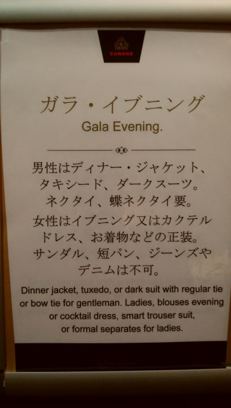 その後、2018年に念願のQEのワールド・クルーズの区間乗船で大阪発着に乗船した際は、明らかにフォーマル度は低下していました。