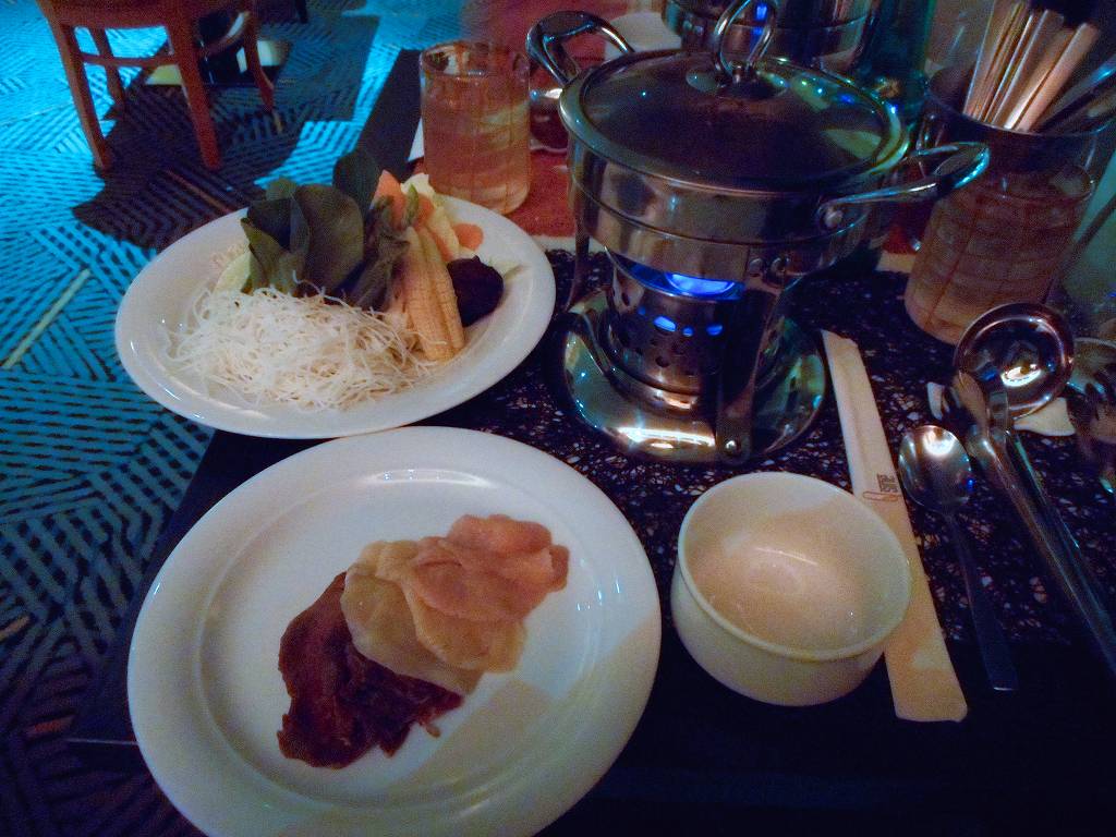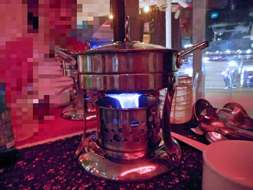 有料レストランになりますが、ゲンティンドリームには、8階デッキのボードウォーク船尾側に火鍋(Hot Pot)があります。航行中はやっているか記憶が定かではありませんが、停泊中には夜景を見ながら屋外で火鍋を楽しむことが出来ます。赤白両方の出汁に入れて食べる火鍋は本格的であり、華僑経営のゲンティンドリームならではの食事ではないかと思います。値段忘れてしまったのですが、結構リーズナブル。少しの追加料金で、とても混んでいる無料のダイニングとは一味違う楽しみ方が出来ますので是非お試しください。
