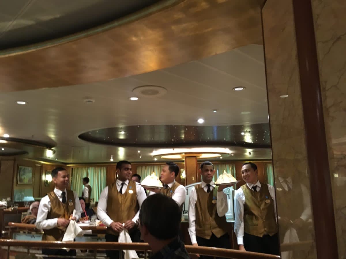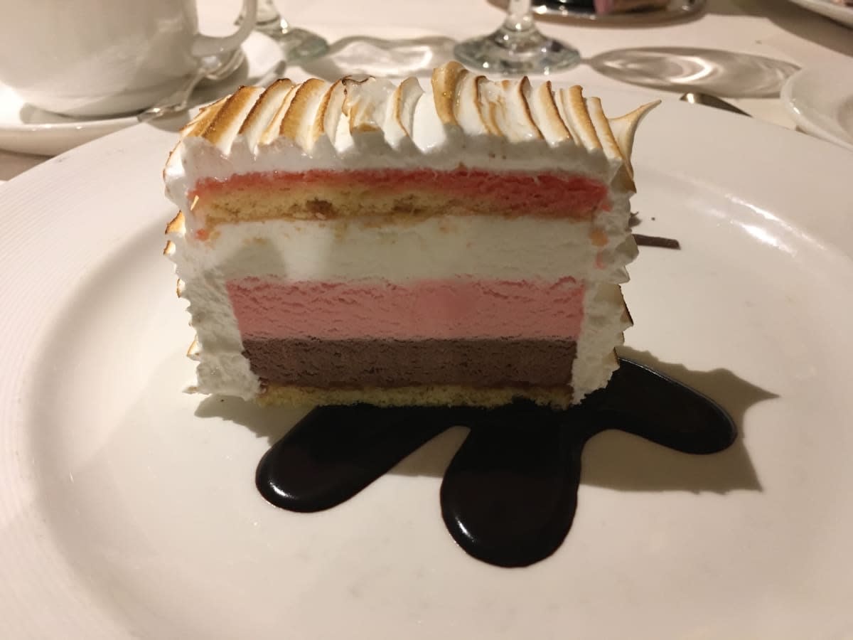 クルーズ中お世話になったレストランスタッフがベイクドアラスカを持ってパレードしてくださるので、他のデザートが気になりつつも、やっぱりお願いするのはベイクドアラスカ。アイスクリームケーキにメレンゲの載ったデザートです。