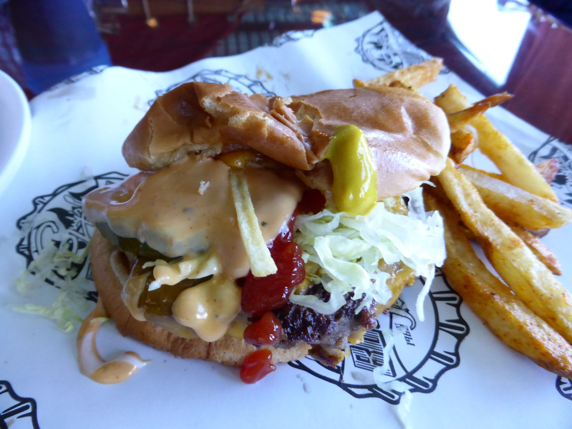 ランチ時など長蛇の列ですができたてジューシーなバーガーは今までたべたなかで最高の味でした!しかも無料です!