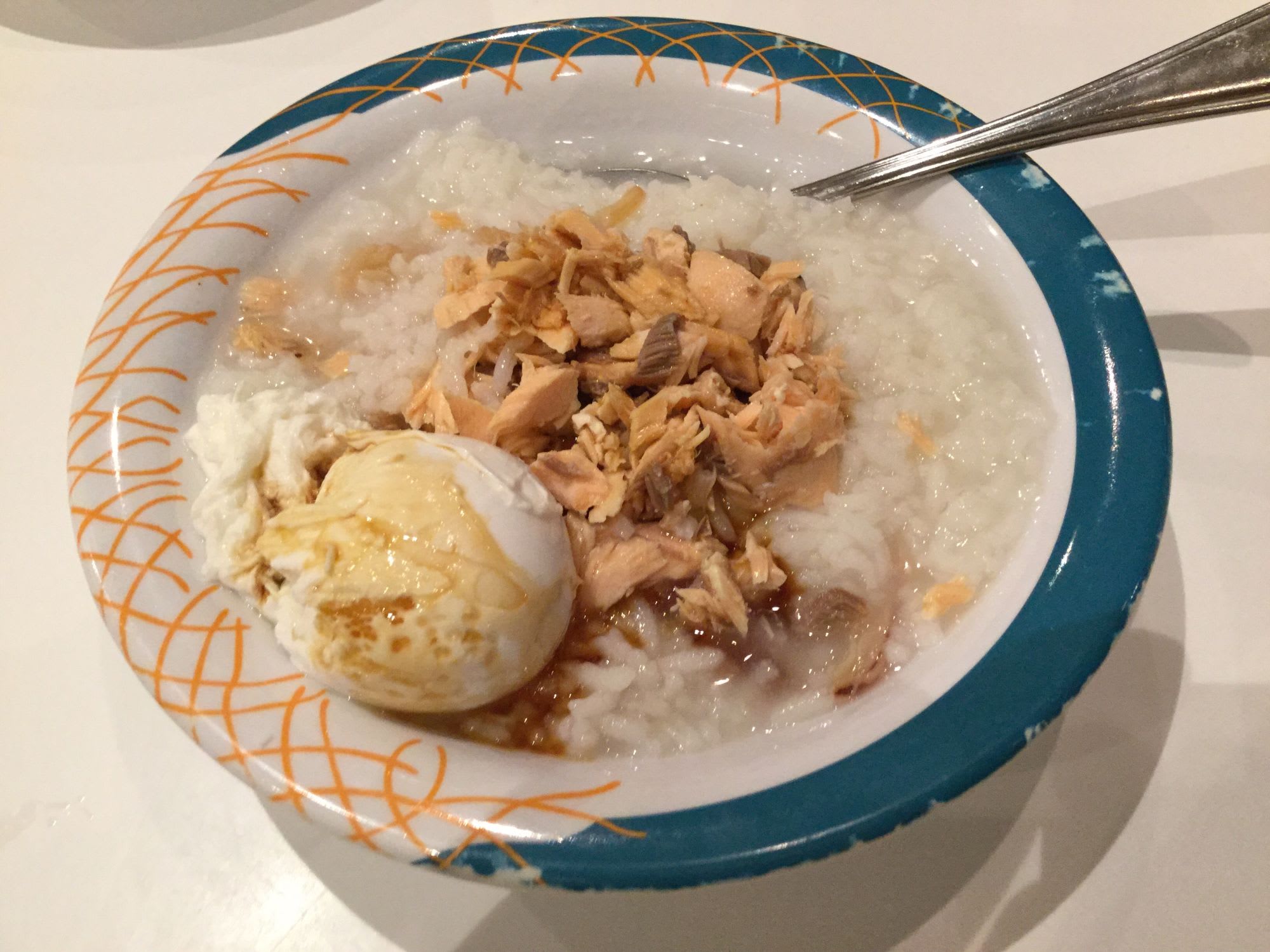 長いクルーズになるとたまには日本食が食べたくなる、しかし有料レストランの日本食は高くてあまり美味しく無い(船にもよると思いますが)!先日乗った船で良いアイデアを見つけました、朝食にお粥を見つけた、夕食に鮭のグリルを見つけた、これはいけると思いついたのが、鮭入りお粥です。夕方鮭をゲットして多少塩して翌日まで冷蔵庫で保存。翌日熱々のお粥にほぐした鮭を乗せたら最高の塩鮭入りお粥にの出来上がり。その後、ポーチドエッグ、ベーコン等を追加で入れて味のバリエーションを楽しみました。次からタッパーを忘れずに持って行くようにします。夕食をメインダイニングで食べる時も、先ずバッフェレストランに寄って酒のつまみになりそうなものを手に入れてから、行くようにしています。カジュアルクルーズではこんな楽しみも良いものです。