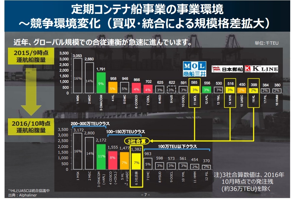 ところが、船会社としてMSCはジャイアントで、コンテナ船部門では、マースクシーランドに次いで、世界第2位です。次の資料は、飛鳥IIでおなじみ日本郵船のIR情報からですが、日本郵船、商船三井、川崎汽船のコンテナ船部門がちょうど2年前に合併を発表し、今年から新しい会社での運行が始まりました。そのBIG3が集まってもまだ6位、船舶量でMSCの半分です。MSCがいかに大きな船会社がお分かりだと思います。