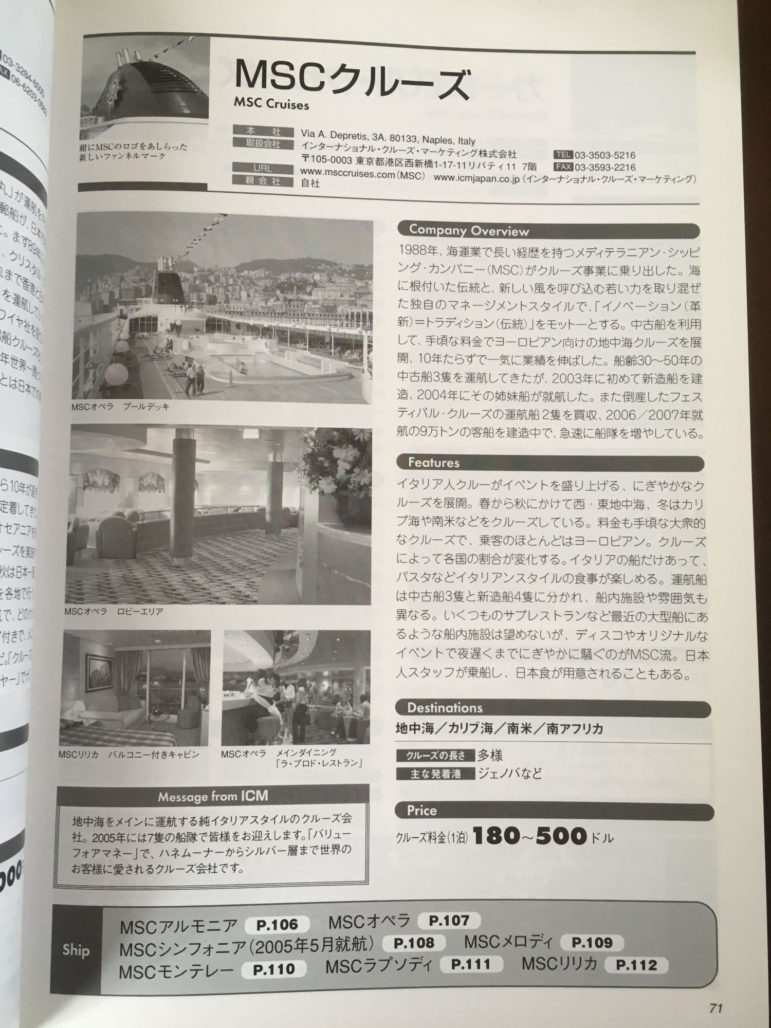 私が持っている資料で一番古い「クルーズシップコレクション2005」(海事プレス社)のMSC社の紹介ページです。