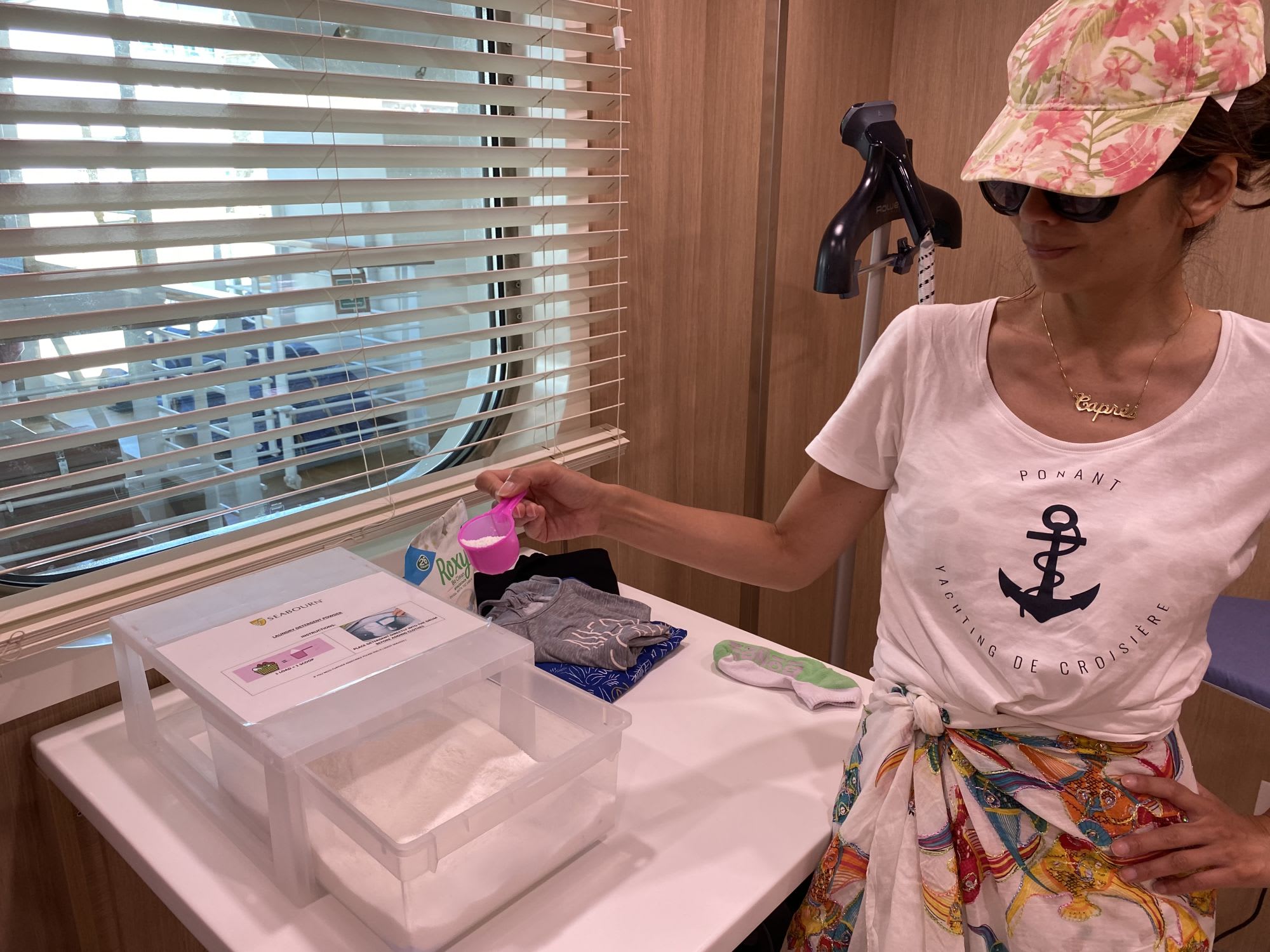 あくまでもロングクルーズに関してですが、ランドリーが付いている機材の場合は旅行中盤に選択に行きますが、ランドリー設備がまれに無い客船もございます。 とは言えクリーニングはお金かかるし、、という事で、洗濯石鹸と洗濯ロープを持参しお部屋で手動でお洗濯しております。